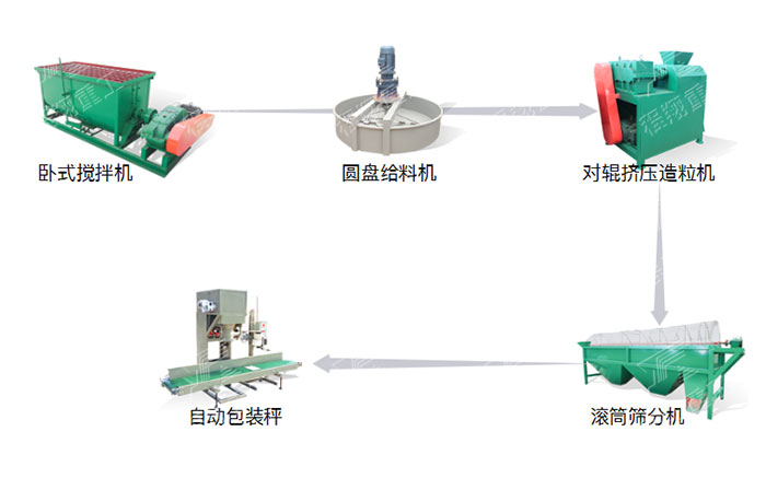 該復合肥生產線主要的設備有:臥式攪拌機1臺、盤式給料機1臺、對輥擠壓造粒機4臺、滾筒篩分機1臺、自動包裝秤1臺。