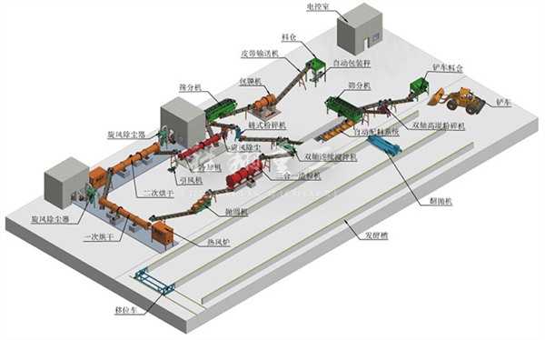 本次牛糞全套有機(jī)肥料設(shè)備生產(chǎn)工藝采用槽式好氧發(fā)酵,利用翻堆槽發(fā)酵既干凈又能最大化的利用有限的場地,增加糞便處理量。由于客戶對于顆粒有機(jī)質(zhì)含量以及NPK有特殊要求,因此我們?yōu)榭蛻魧iT定制了一臺三倉的靜態(tài)配料系統(tǒng)。