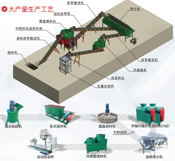 生產(chǎn)顆粒鉀肥的主要設備是干粉造粒機,主要配套設備包括強制喂料器(主料斗)、對輥軋片機組、機架平臺、破碎整粒機、多級篩分器、鏈板輸送機、臥式攪拌機等。