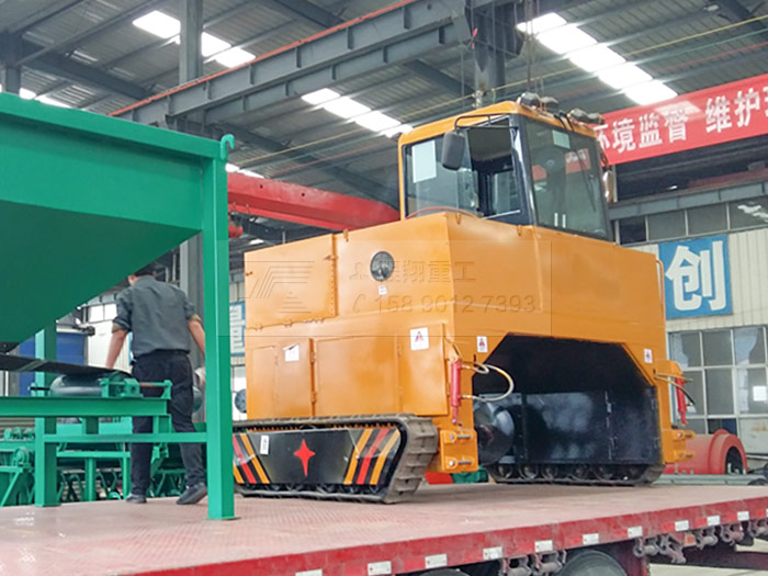 2.行駛中整車騎跨在預(yù)先堆置的長(zhǎng)條形堆體上,由機(jī)架下掛裝的旋轉(zhuǎn)刀軸對(duì)堆體原料實(shí)施翻拌、蓬松、移堆,車過(guò)之后篡成新的條形垛堆。