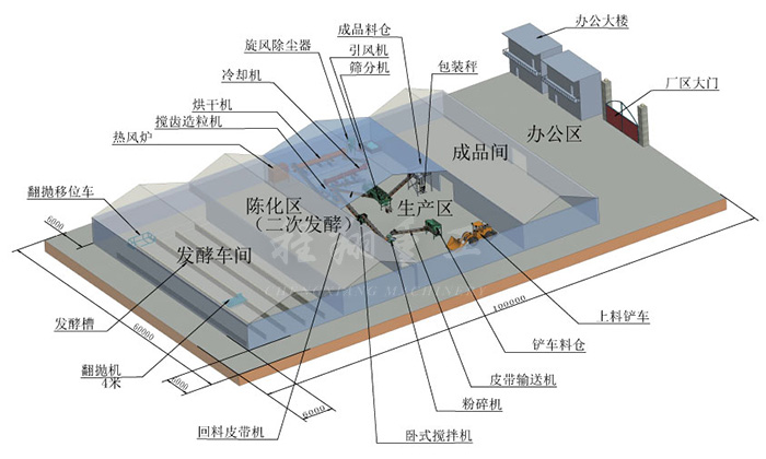 本次牛糞全套有機(jī)肥料設(shè)備生產(chǎn)工藝采用槽式好氧發(fā)酵,利用翻堆槽發(fā)酵既干凈又能最大化的利用有限的場地,增加糞便處理量。由于客戶對于顆粒有機(jī)質(zhì)含量以及NPK有特殊要求,因此我們?yōu)榭蛻魧iT定制了一臺三倉的靜態(tài)配料系統(tǒng)。
